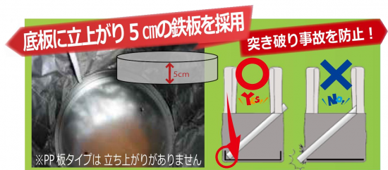 ・底板の側面に立ち上がりがあり底面端部からの突き破り事故を防ぎスムーズな物の出し入れが可能